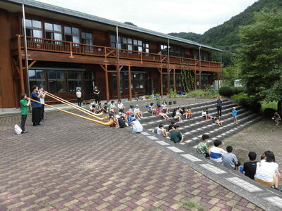 体育館でお聞きし、体験もさせていただきました。そして演奏終了後サプライズで校舎南側のテラスへ。三岳の谷へ向かって演奏してくださいました。遠くまで響き渡り、最後の音が山々にこだまして返ってくると歓声が上がっていました。